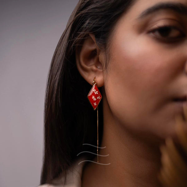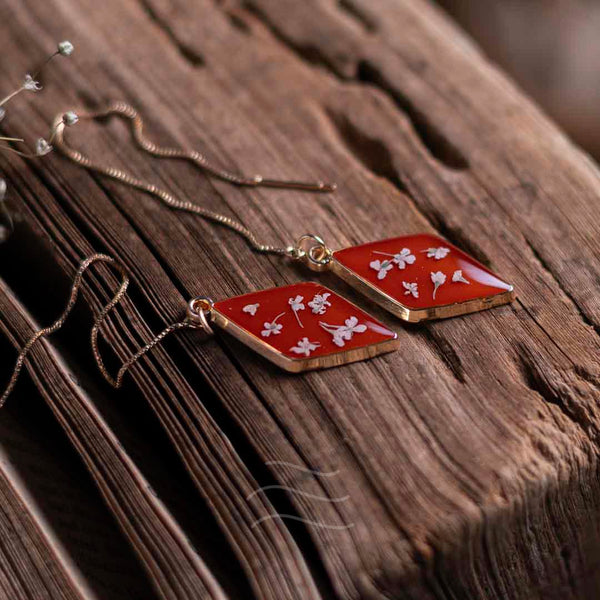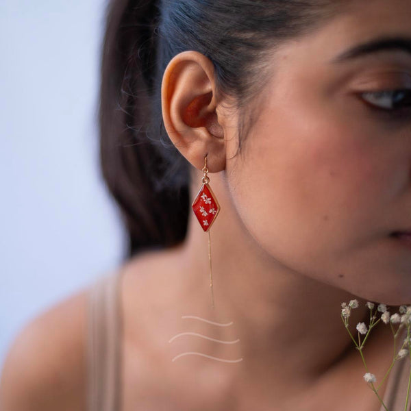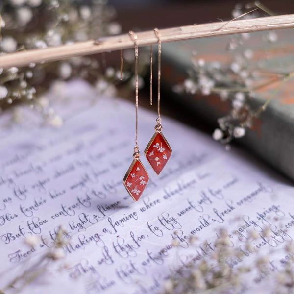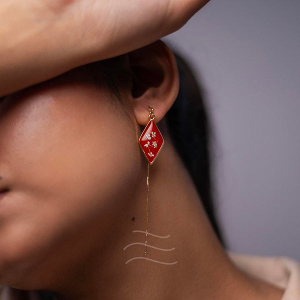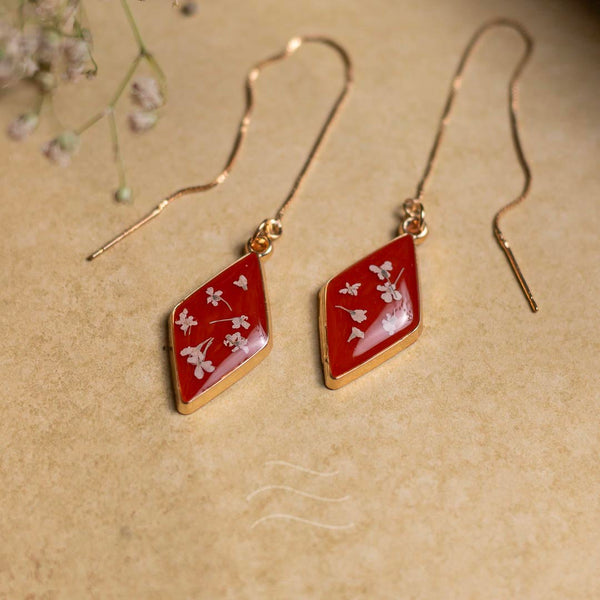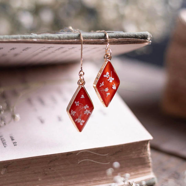 These earrings are inspired by the last few reaches of the sunset's sanguine rays. The few moments before the sky shifts to cooler colors, and the stars make their presence known fully. The flowers featured within this pair are Queen Anne's Lace Flowers. They are the constellations to the sundown, the awe and wonder to the peace and serenity.