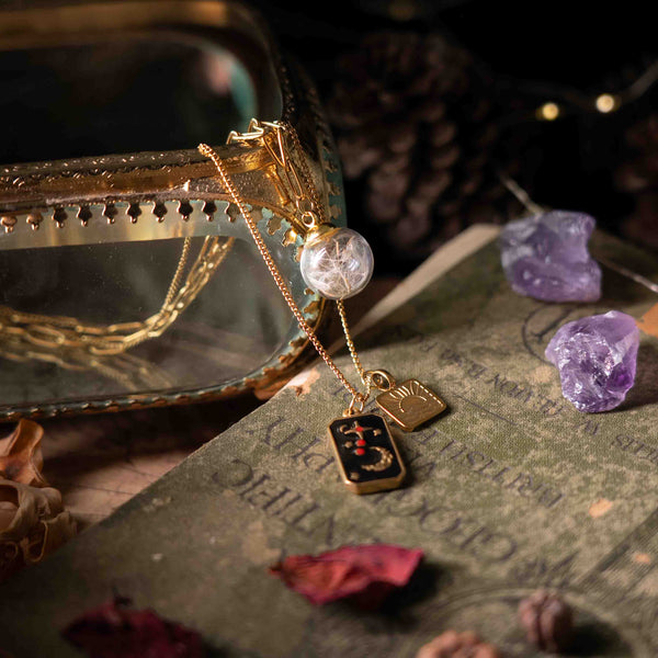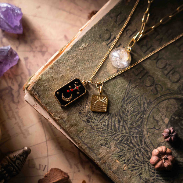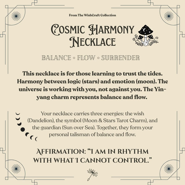 This necklace has three energies. The rising sun over calm waters embodies the art of flow, the harmony between effort and surrender. A glass vial of dandelion seeds completes it, reminding you that serenity isn’t found in control, but in trust. The Moon and stars tarot charm represents harmony in the Universe