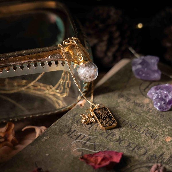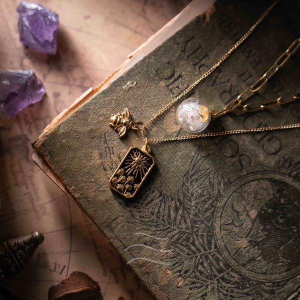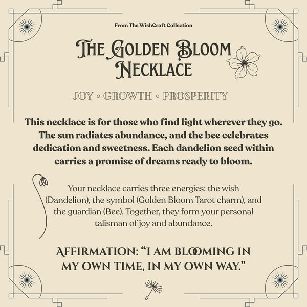 This necklace has a "Radiating Sun" Tarot card charm which glows with abundance. The bee nature’s little creator celebrates dedication and prosperity. The encased dandelion seeds, symbolises wishes ready to bloom. Wear it as a promise to shine in your own time and season.