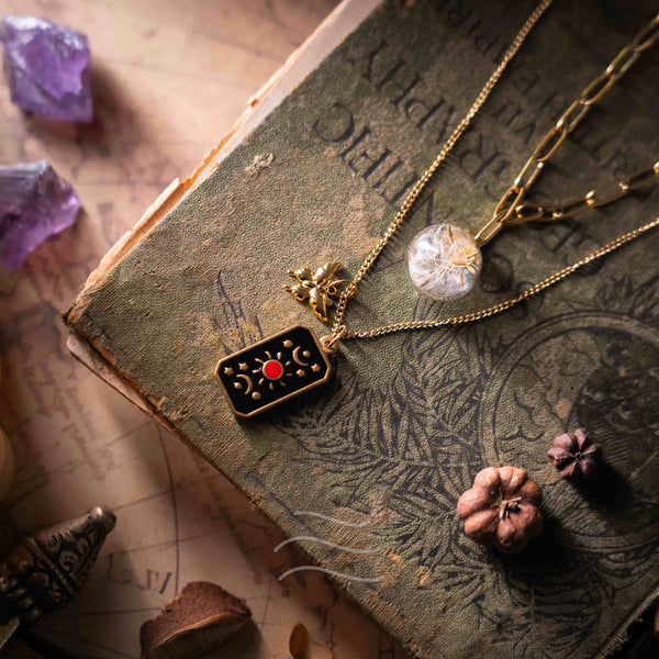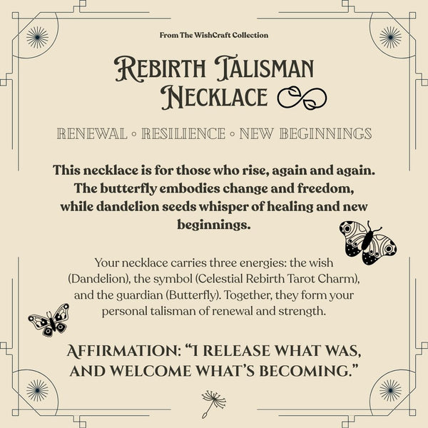 This necklace has a "Celestial Rebirth" Tarot card charm which represents new beginnings. The butterfly symbolises transformation and lightness after the storm, while dandelion seeds within the vial represent healing and new dreams. Wear it as a tribute to your strength, your softness, and your endless becoming.