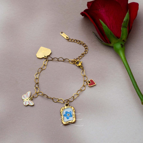 This sentimental piece features a vibrant red heart charm, a polished heart token, and a delicate butterfly charm that symbolizes a love that, though constant, continues to evolve and grow. At the center is a genuine forget-me-not flower, perfectly preserved in a dainty frame to serve as a living testimony to your shared history.